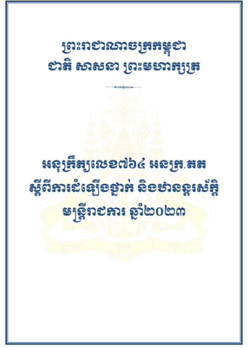 អនុក្រឹត្យលេខ ៧៦៤ អនក្រ.តត ស្តីពីការដំឡើងថ្នាក់ និងឋានន្តរស័ក្តិមន្រ្តីរាជការ ឆ្នាំ២០២៣