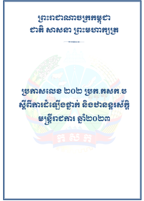 ប្រកាសលេខ ២០២ ប្រក.កសក.ប ស្តីពីការដំឡើងថ្នាក់ និងឋានន្តរស័ក្តិមន្រ្តីរាជការ ឆ្នាំ២០២៣