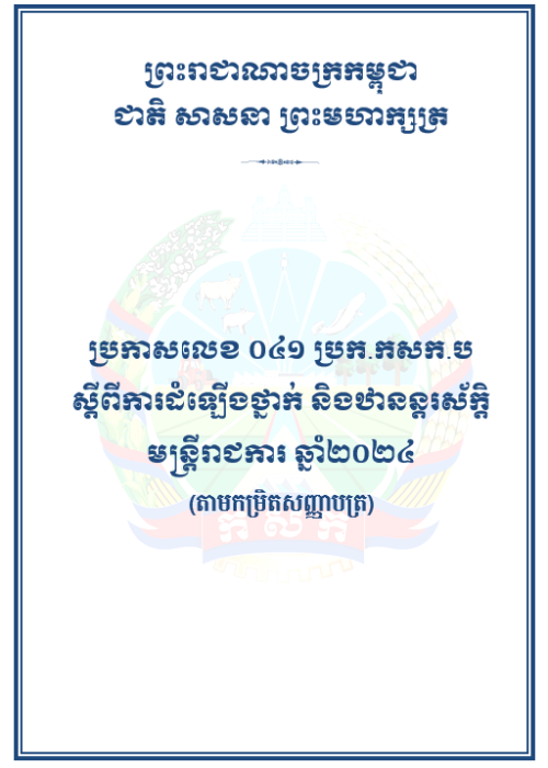 ប្រកាសលេខ ០៤១ ប្រក.កសក.ប ស្តីពីការដំឡើងថ្នាក់ និងឋានន្តរស័ក្តិ មន្រ្តីរាជការ ឆ្នាំ២០២៤ (តាមសញ្ញាបត្រ)